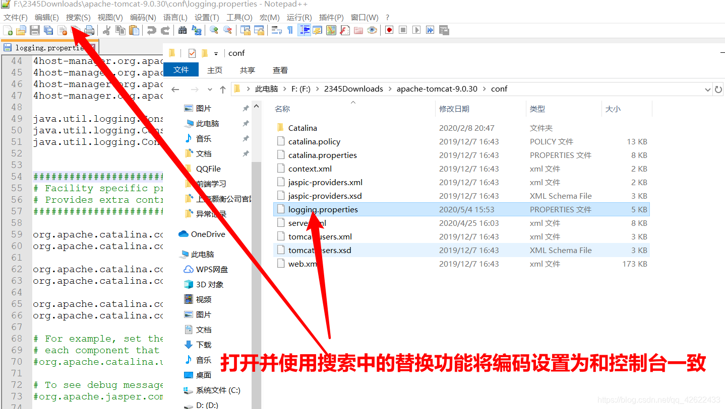 首先使用chcp查看控制台编码,如果显示936说明是GBK,65001则是UTF-8,再到tomcat-conf中的logging.properties文件中将编码更改为和控制台一致,我这里控制台是936,因此将文件的UTF-8全部改为GBK。