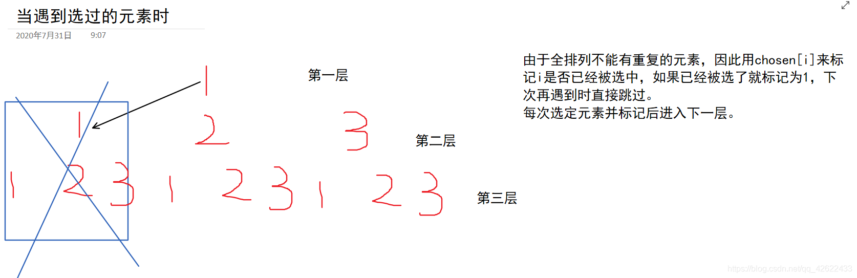 因此,我们需要用一个chosen[i]来表示i这个值是否已经被选过。chosen[i]=1时已经被选过,chosen[i]=0时未选过。