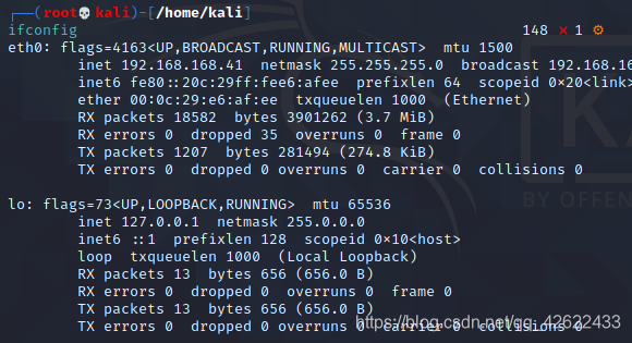 然后再用ifconfig查询一下本地Kali虚拟机的ip和默认网关