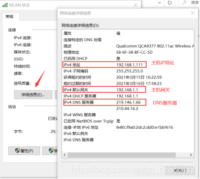 这里先查看宿主机(就是虚拟机所在的主机)的网络相关信息,因为配置虚拟机桥接模式时需要与本机一致。