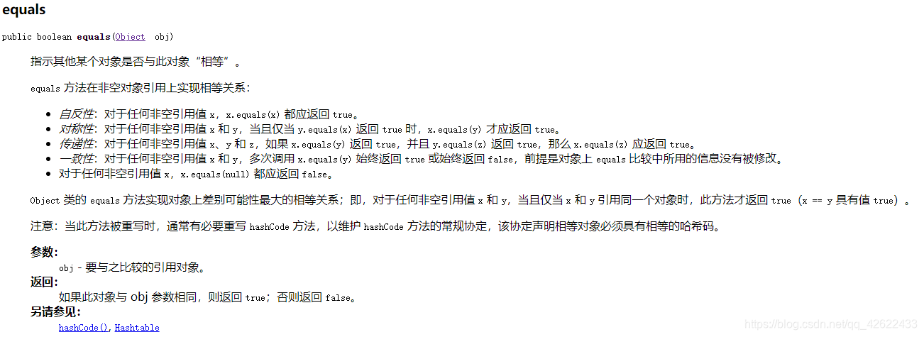 在java.lang.Object类中可以看到对equals方法的说明