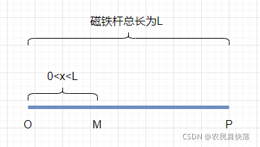 首先假设有一个长为L米的磁铁杆,记左端为O,右端为M,中间任取一点为P,因为P是任取的,所以OP可记为变量x,如图所示: