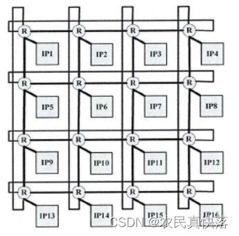 一个典型的NoC拓扑结构(2D-Mesh)如图所示,图中R是路由器,NI是网络接口,NoC拓扑将IP核之间的通信转换为路由器之间的通信。