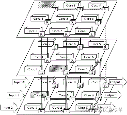 3D Mesh为三维的网格结构,将多个2D Mesh叠加并对应节点连接起来,这样做进一步降低了网络直径和平均距离,但物理实现难度比较大。