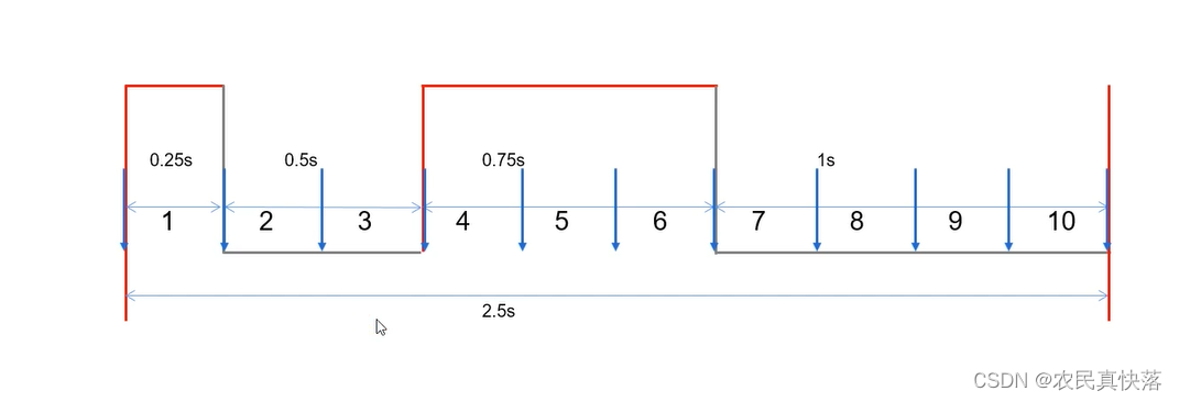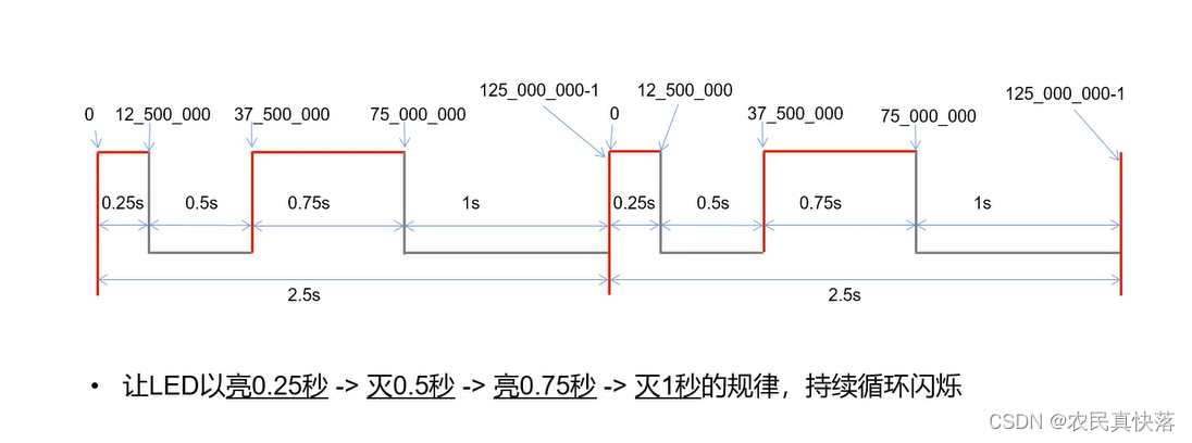 我们的目标是让LED以**【亮0.25秒->灭0.5秒->亮0.75秒->灭1秒】**的规律,持续循环闪烁。