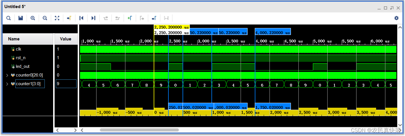 testbench代码 1 2 3 4 5 6 7 8 9 10 11 12 13 14 15 16 17 18 19 20 21 22 23 24 25 `timescale 1 ns / 1 ns module tb_led_ctrl1 (); reg clk; reg rst_n; wire led_out; initial clk = 1 ; always #10 clk = ~clk; led_ctrl1 led_ctrl1_inst0 ( .clk (clk), .rst_n (rst_n), .led_out (led_out) ); defparam led_ctrl1.MCNT = 12500 - 1 ; initial begin rst_n = 0 ; #201 ; rst_n = 1 ; #20_000_000 ; $stop; end endmodule