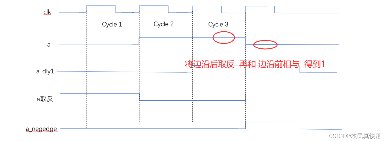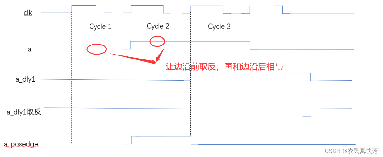 下降沿同理,边沿后取反再和边沿前相与,得到1,说明是下降沿。 边沿前电平可以通过a打一拍得到。