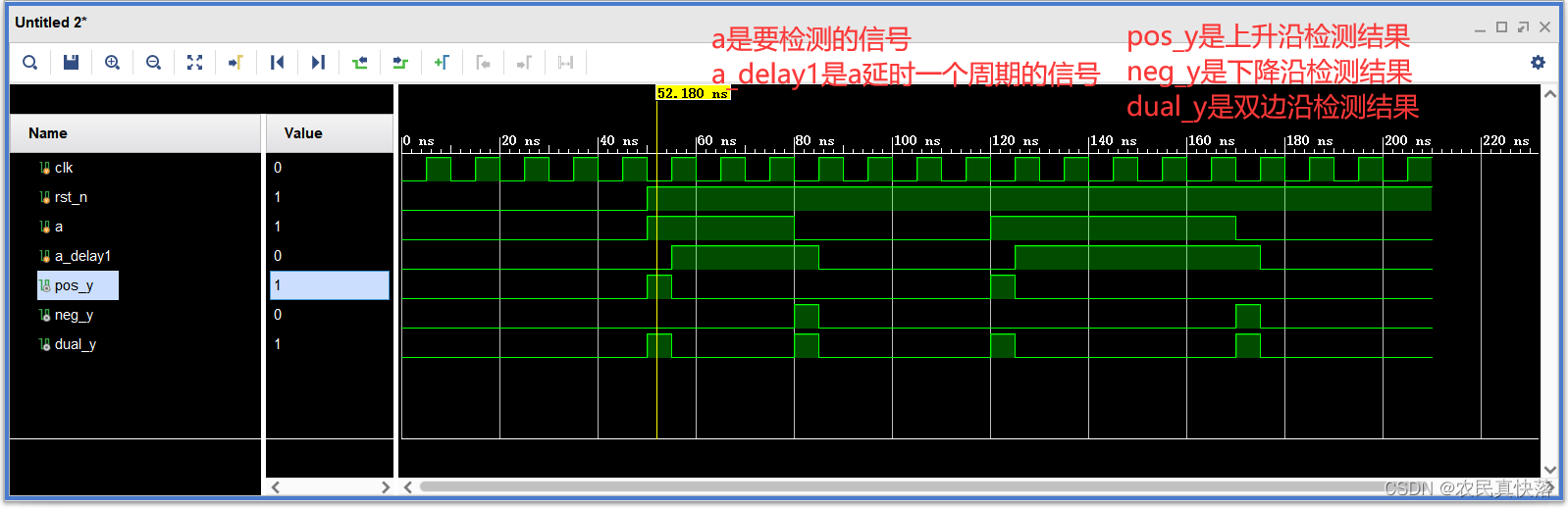 如图所示,我们的目标是当检测到a从0变成1时,令a_posedge为高电平,其余情况a_posedge均为低电平。